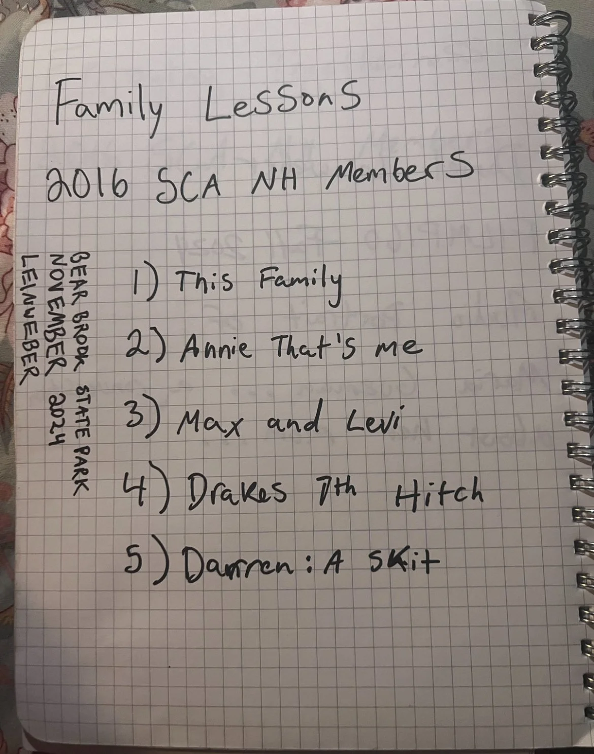 Family Lessons with the 2016 Student Conversation Association of New Hampshire Members. Recorded at Bear Brook State Park on Saturday November 9 and Sunday November 10, 2024.
